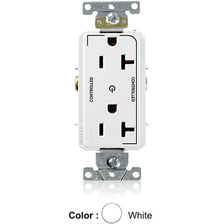 Leviton 16352-2PW, Decora Plus Straight Blade Duplex Receptacle, Heavy-Duty Industrial Specification Grade, Two Outlets Marked ''Controlled'', Smooth Face, 20A 125V, NEMA 5-20R, 2-Pole, 3-Wire, Back and Side Wire, White