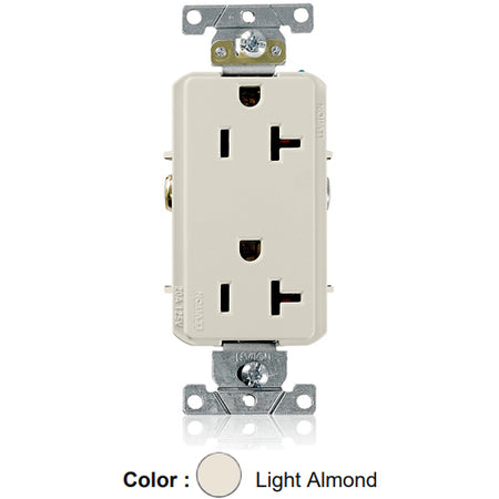 Leviton 16352-T, Decora Plus Straight Blade Duplex Receptacle, Heavy-Duty Industrial Specification Grade, Smooth Face, 20A 125V, NEMA 5-20R, 2-Pole, 3-Wire, Back and Side Wire, Light Almond