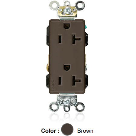 Leviton 16362, Decora Plus Straight Blade Duplex Receptacle, Heavy-Duty Industrial Specification Grade, Smooth Face, 20A 125V, NEMA 5-20R, 2-Pole, 3-Wire, Back and Side Wire, Brown