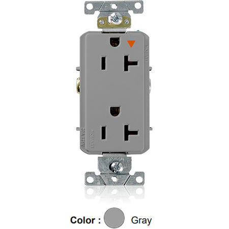 Leviton 16362-GIG, Decora Plus Straight Blade Duplex Receptacle, Heavy-Duty Industrial Specification Grade, Smooth Face, Isolated Ground, 20A 125V, NEMA 5-20R, 2-Pole, 3-Wire, Back and Side Wire, Gray