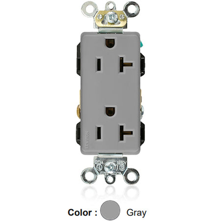 Leviton 16362-GY, Decora Plus Straight Blade Duplex Receptacle, Heavy-Duty Industrial Specification Grade, Smooth Face, 20A 125V, NEMA 5-20R, 2-Pole, 3-Wire, Back and Side Wire, Gray