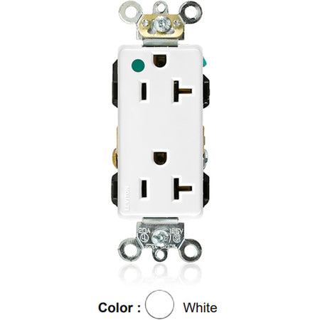 Leviton 16362-HGW, Decora Plus Straight Blade Duplex Receptacle, Extra Heavy-Duty Hospital Grade, Smooth Face, 20A 125V, NEMA 5-20R, 2-Pole, 3-Wire, Back and Side Wire, White