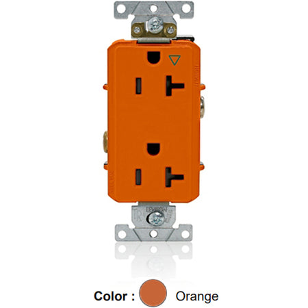 Leviton 16362-OIG, Decora Plus Straight Blade Duplex Receptacle, Heavy-Duty Industrial Specification Grade, Smooth Face, Isolated Ground, 20A 125V, NEMA 5-20R, 2-Pole, 3-Wire, Back and Side Wire, Orange