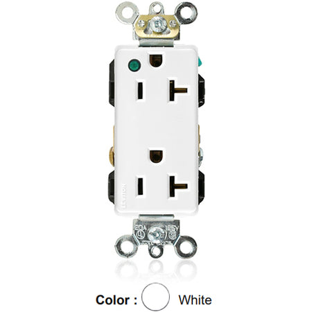 Leviton 16362-PLW, Decora Plus Straight Blade Duplex Receptacle, Extra Heavy-Duty Hospital Grade, Power Indication, Smooth Face, 20A 125V, NEMA 5-20R, 2-Pole, 3-Wire, Back and Side Wire, White