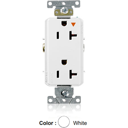 Leviton 16362-WIG, Decora Plus Straight Blade Duplex Receptacle, Heavy-Duty Industrial Specification Grade, Smooth Face, Isolated Ground, 20A 125V, NEMA 5-20R, 2-Pole, 3-Wire, Back and Side Wire, White
