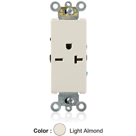 Leviton 16441-T, Decora Plus Straight Blade Single Receptacle, Commercial Specification Grade, Smooth Face, 20A 250V, NEMA 6-20R, 2-Pole, 3-Wire, Side Wire Only, Light Almond