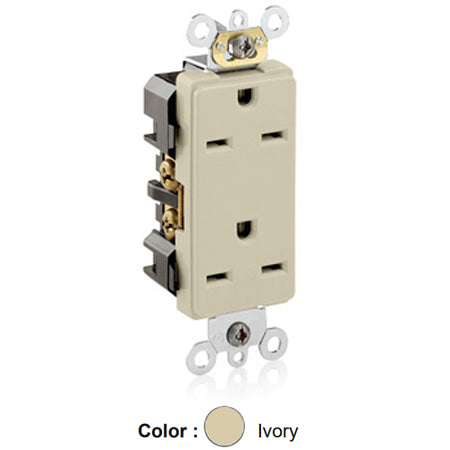 Leviton 16662-I, Decora Plus Straight Blade Duplex Receptacle, Commercial Specification Grade, Smooth Face, 15A 250V, NEMA 6-15R, 2-Pole, 3-Wire, Back and Side Wire, Ivory