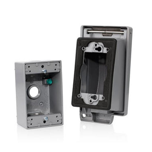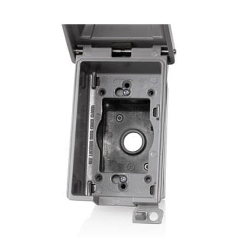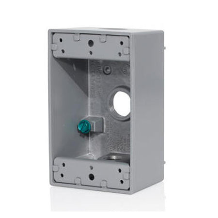 Leviton 1GM53-GY, 1-Gang Die-Cast Weatherproof Box with Three 1/2'' Diameter Outlets, Includes Mounting Hardware and Inserts to Cover Unused Openings, Gray