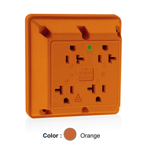 Leviton 21254-IG, 4-in-1 Quadruplex Receptacle, Heavy-Duty Hospital Grade, Isolated Ground , 20A 125V, NEMA 5-20R, 2-Pole, 3-Wire, Side Wire Only, Orange