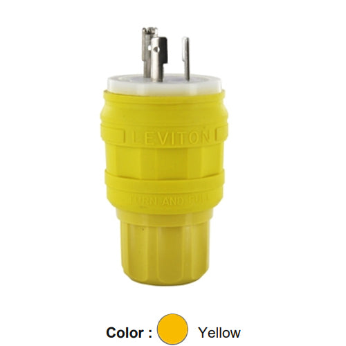 Leviton 22W07, Wetguard Watertight Locking Plug, Industrial Grade, 20A 347V, NEMA L24-20P, 2-Pole, 3-Wire, Grounding, Yellow