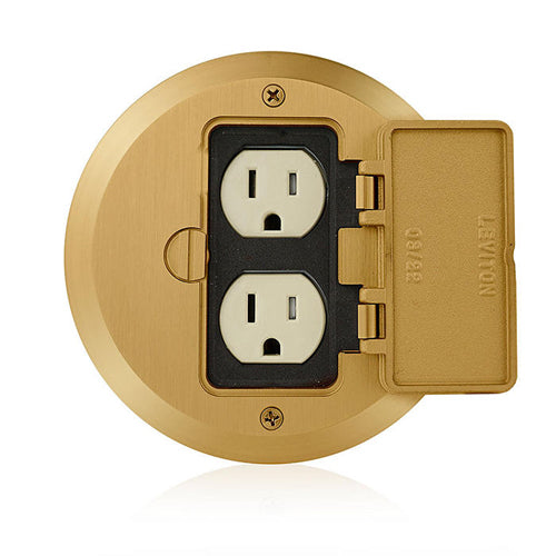 Leviton 25251-TFB, 1-Gang Floor Box Receptacle Assembly, 15A 125V, NEMA 5-15R, 2-Pole, 3-Wire, Tamper-Resistant Duplex Receptacle, Straight Blade, Commercial Grade, Round Cover with Brass-Finish Plate, Ivory Receptacle