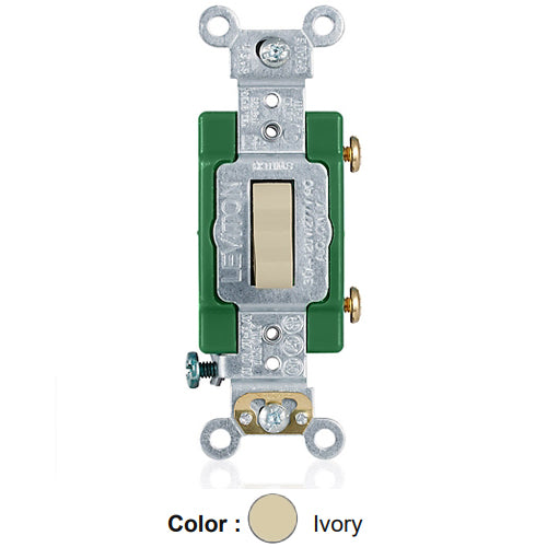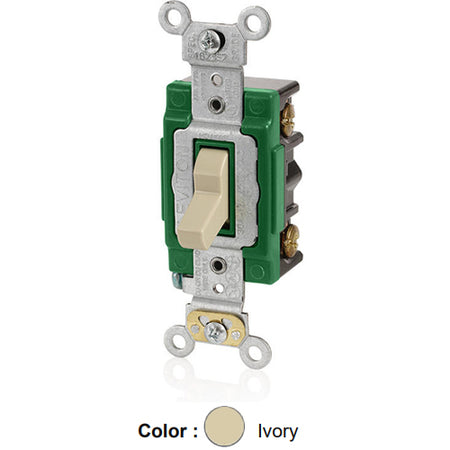 Leviton 3031-LHI, Illuminated OFF Single-Pole AC Quiet Toggle Switch, Lighted Handle, Does Not Require a Neutral Wire, Industrial Grade, 30A 120V AC, Self Grounding, Back & Side Wired, Ivory