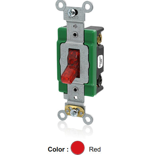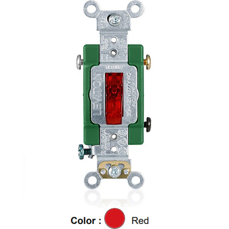 Leviton 3031-PLR, Illuminated ON Single-Pole AC Quiet Toggle Switch, Pilot Light, Requires a Neutral Wire, Industrial Grade, 30A 120V AC, Self Grounding, Back & Side Wired, Red