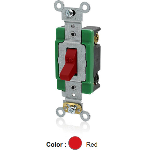 Leviton 3032-2R, Standard Double Pole AC Quiet Toggle Switch, Extra Heavy-Duty Industrial Specification Grade, 30A 120/277V AC, Self Grounding, Back & Side Wired, Red