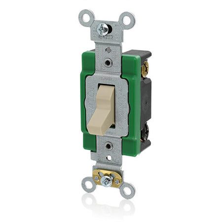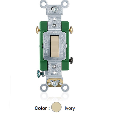 Leviton 3033-2I, Standard 3-Way AC Quiet Toggle Switch, Extra Heavy-Duty Industrial Specification Grade, 30A 120/277V AC, Self Grounding, Back & Side Wired, Ivory