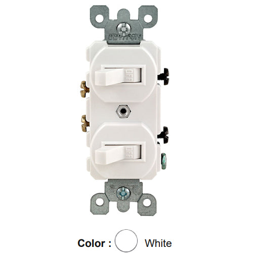 Leviton 5224-2W, Duplex Style Single-Pole/Single-Pole AC Combination Switch, Commercial Grade, 15 Amp, 120/277 Volt, Grounding, Side Wired, White