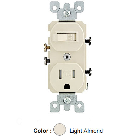 Leviton 5225-T, Duplex Style Single-Pole/5-15R AC Combination Switch, Commercial Grade, 15 Amp, 120 Volt, Grounding, Side Wired, Light Almond