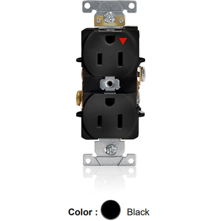 Leviton 5262-IGE, Standard Straight Blade Duplex Receptacle, Heavy-Duty Industrial Specification Grade, Smooth Face, 15A 125V, NEMA 5-15R, 2-Pole, 3-Wire, Back and Side Wire, Black