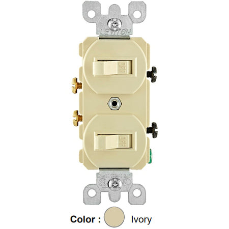 Leviton 5334-I, Duplex Style Single-Pole/Single-Pole AC Combination Switch, Commercial Grade, 20 Amp, 120/277 Volt, Non-Grounding, Side Wired, Ivory