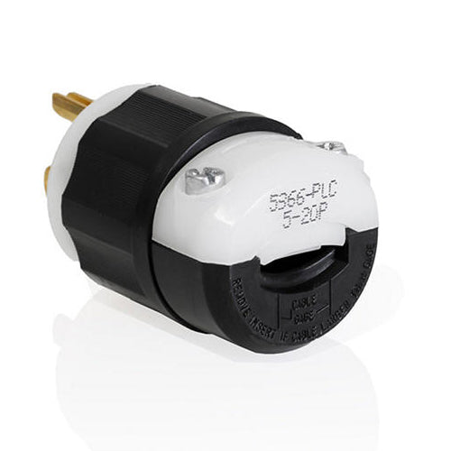 Leviton 5366-PLC, Straight Blade Plug, Industrial Grade, Power Indication, 20A 125V, NEMA 5-20P, 2-Pole, 3-Wire, Grounding, Black/White