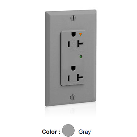 Leviton 5380-IGG, Decora Plus Surge Protective Duplex Receptacle, Commercial Specification Grade, Indicator Light, Isolated Ground, 20A 125V, NEMA 5-20R, 2-Pole, 3-Wire, Back and Side Wire, Gray