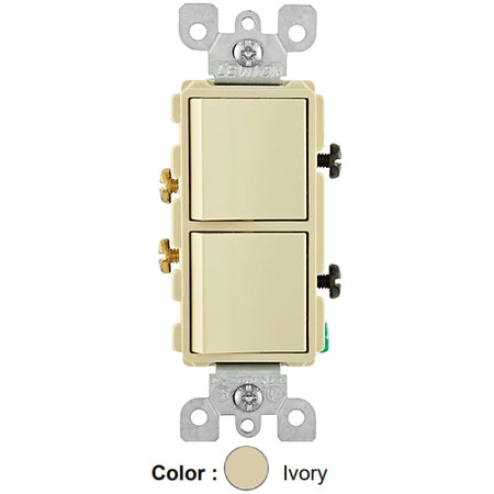 Leviton 5627-I, Decora Single-Pole/Single-Pole AC Combination Switch, Residential Grade, 20 Amp, 120/277 Volt, Grounding, Side Wired, Ivory