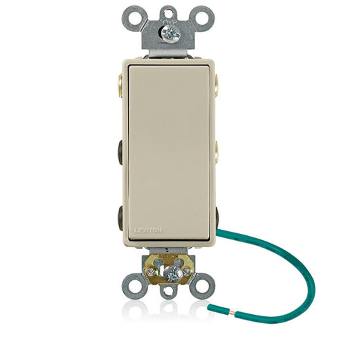 Leviton 5686-2I, Decora Plus Double Pole Double Throw Rocker Switch, Maintained Contact, Center Off, Commercial Grade, 15 Amp, 120/277 Volt, Green Grounding Lead, Self-Grounding, Back and Side Wired, Ivory