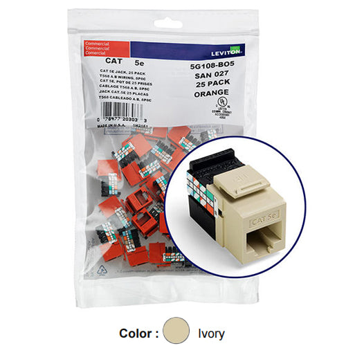 Leviton 5G108-BI5, GIGAMAX Cat 5e UTP Quickport Jack, 25-Pack, Ivory