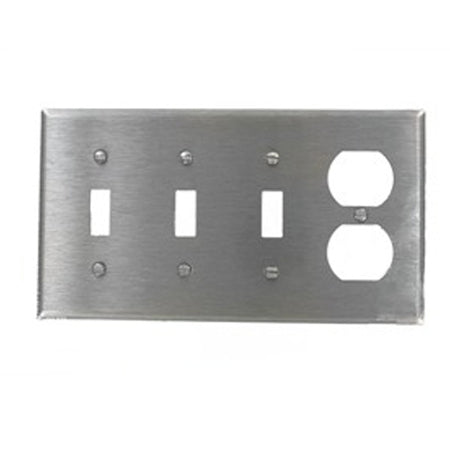 Leviton 84043, 4-Gang 3-Toggle and 1-Duplex Device Combination Wallplate, Standard Size, 430 Stainless Steel, Device Mount, Stainless Steel