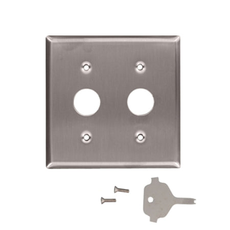 2-Gang Key Lock Power Switch Device Switch Wallplate, Standard Size, 302 Stainless Steel, Device Mount, w/ Spanner Screws and Tool, Pierced One Single 0.880 Diameter. For Use With Corbin Key Lock Switch. Satin Finish- Stainless Stee