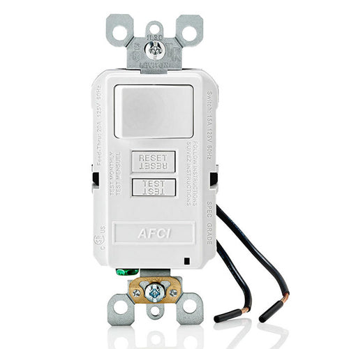 Leviton AFSW1-W, SmartlockPro Outlet Branch Circuit AFCI Combination Switch, LED Indicator Light, Wallplate Included, 15 Amp, 125 Volt, Back & Side Wired, Self-Grounding, White