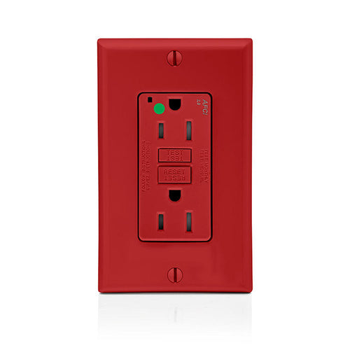 Leviton AFTR1-HGR, SmartlockPro Branch Circuit AFCI Duplex Receptacle, Tamper-Resistant, LED Indicator Light, Heavy-Duty Hospital Grade, Wallplate Included, 15A 125V, NEMA 5-15R, Back & Side Wired, Self-Grounding, Red