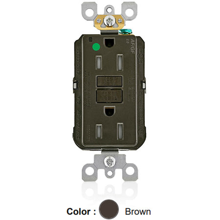 Leviton AGTR1-HG, SmartlockPro Dual Function AFCI/GFCI Duplex Receptacle, Hospital Grade, Tamper-Resistant, LED Indicator Light, 15A 125V, NEMA 5-15R, Back & Side Wired, Self-Grounding, Brown