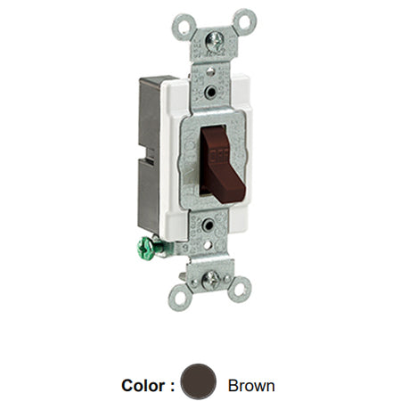 Leviton CS120-2, Standard Single Pole AC Quiet Toggle Switch, Commercial Specification Grade, 20A 120/277V AC, Grounding, Side Wired, Brown