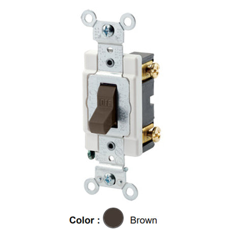 Leviton CSB1-20, Standard Single Pole AC Quiet Toggle Switch, Commercial Specification Grade, 20A 120/277V AC, Grounding, Back and Side Wired, Brown