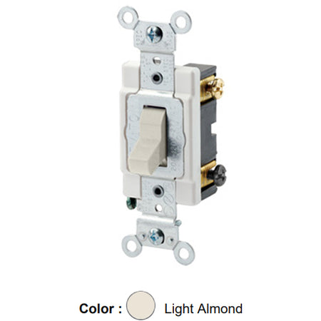 Leviton CSB3-15T, Standard 3-Way AC Quiet Toggle Switch, Commercial Specification Grade, 15A 120/277V AC, Grounding, Back and Side Wired, Light Almond