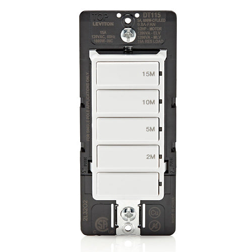 Leviton DT115-1LW, 15-Minute Decora In-Wall Countdown Timer, 15 Amp, Single Pole, 2-5-10-15 Minutes, 1/2 HP/9.8A Fan/Motor, White