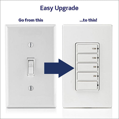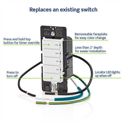 The Decora 15-Minute Countdown Timer Switch has 5 buttons with 2-minute, 5-minute, 10-minute and 15-minute preset time options and a manual off button. Single Pole, 600W LED/CFL, 1800W Incandescent/Halogen, 1200VA Magnetic Low Voltage/Electronic Low Voltage/Fluorescent, 1/2 HP/9.8A Fan/Motor, 15A Resistive. Can be installed with or without a neutral wire, wallplate sold separately