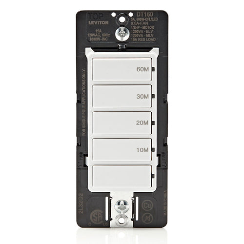 Leviton DT160-1LW, 60-Minute Decora In-Wall Countdown Timer, 15 Amp, Single Pole, 10-20-30-60 Minutes, 1/2 HP/9.8A Fan/Motor, White