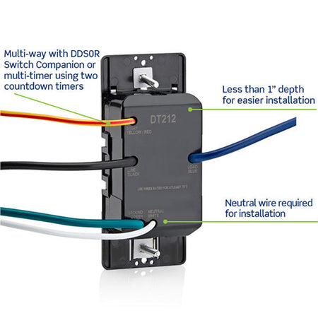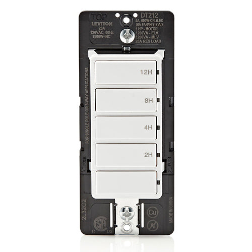 Leviton’s 12-Hour Countdown Timer Switch has 5-buttons with 2-hour, 4-hour, 8-hour and 12-hour time options and a manual off button. The larger load capacity can handle larger fixtures and fans. Single pole, multi-way using DD0SR Switch Companion or multi-timer using two DT212 countdown timers. 600W LED/CFL, 1800W Incandescent/Halogen, 1200VA Magnetic Low Voltage/Electronic Low Voltage/Fluorescent, 1 HP/16A Fan/Motor, 20A Resistive/16A Inductive. Requires a neutral wire for installation, wallplate sold separately