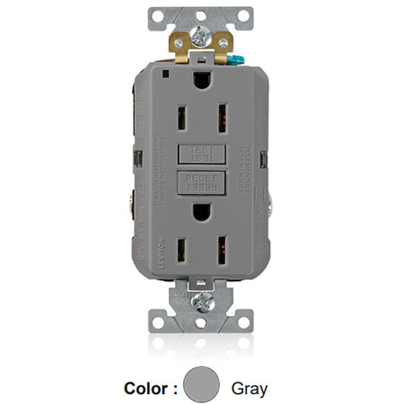 Leviton G5262-GY, SmartlockPro Self-Test GFCI Duplex Receptacle, LED Power Indication, Extra Heavy-Duty Industrial Specification Grade, 15A 125V, NEMA 5-15R, 2-Pole, 3-Wire, Back and Side Wired, Self-Grounding, Gray