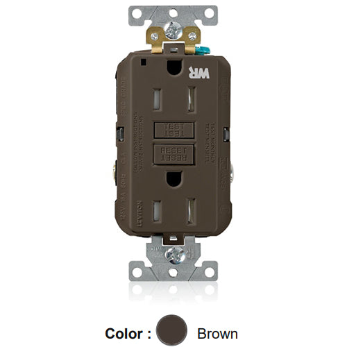 Leviton G5262-WT, SmartlockPro Weather & Tamper-Resistant Self-Test GFCI Duplex Receptacle, LED Power Indication, Extra Heavy-Duty Industrial Specification Grade, 15A 125V, NEMA 5-15R, 2-Pole, 3-Wire, Back and Side Wired, Self-Grounding, Brown