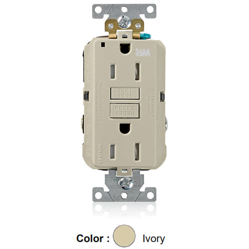 Leviton G5262-WTI, SmartlockPro Weather & Tamper-Resistant Self-Test GFCI Duplex Receptacle, LED Power Indication, Extra Heavy-Duty Industrial Specification Grade, 15A 125V, NEMA 5-15R, 2-Pole, 3-Wire, Back and Side Wired, Self-Grounding, Ivory