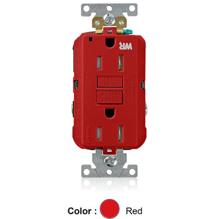 Leviton G5262-WTR, SmartlockPro Weather & Tamper-Resistant Self-Test GFCI Duplex Receptacle, LED Power Indication, Extra Heavy-Duty Industrial Specification Grade, 15A 125V, NEMA 5-15R, 2-Pole, 3-Wire, Back and Side Wired, Self-Grounding, Red