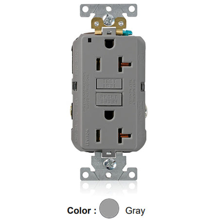 Leviton G5362-GY, SmartlockPro Self-Test GFCI Duplex Receptacle, LED Power Indication, Extra Heavy-Duty Industrial Specification Grade, 20A 125V, NEMA 5-20R, 2-Pole, 3-Wire, Back and Side Wired, Self-Grounding, Gray