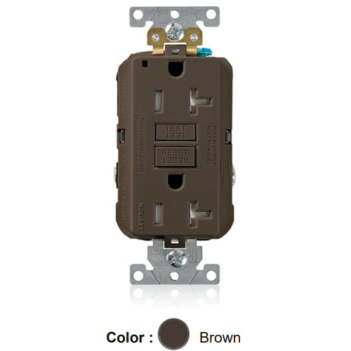 Leviton G5362-T0, SmartlockPro Tamper-Resistant Self-Test GFCI Duplex Receptacle, LED Power Indication, Extra Heavy-Duty Industrial Specification Grade, 20A 125V, NEMA 5-20R, 2-Pole, 3-Wire, Back and Side Wired, Self-Grounding, Brown