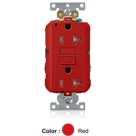 Leviton G5362-TR, SmartlockPro Tamper-Resistant Self-Test GFCI Duplex Receptacle, LED Power Indication, Extra Heavy-Duty Industrial Specification Grade, 20A 125V, NEMA 5-20R, 2-Pole, 3-Wire, Back and Side Wired, Self-Grounding, Red