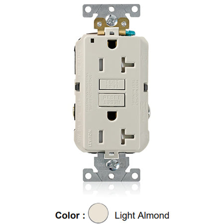 Leviton G5362-TT, SmartlockPro Tamper-Resistant Self-Test GFCI Duplex Receptacle, LED Power Indication, Extra Heavy-Duty Industrial Specification Grade, 20A 125V, NEMA 5-20R, 2-Pole, 3-Wire, Back and Side Wired, Self-Grounding, Light Almond