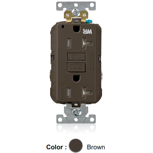 Leviton G5362-WT, SmartlockPro Weather & Tamper-Resistant Self-Test GFCI Duplex Receptacle, LED Power Indication, Extra Heavy-Duty Industrial Specification Grade, 20A 125V, NEMA 5-20R, 2-Pole, 3-Wire, Back and Side Wired, Self-Grounding, Brown