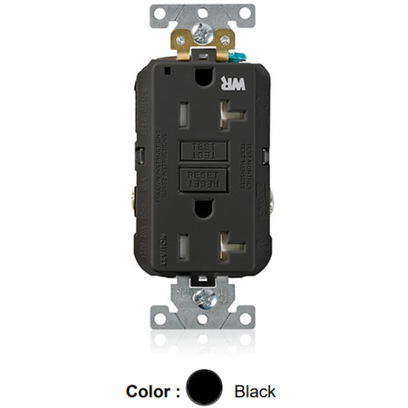Leviton G5362-WTE, SmartlockPro Weather & Tamper-Resistant Self-Test GFCI Duplex Receptacle, LED Power Indication, Extra Heavy-Duty Industrial Specification Grade, 20A 125V, NEMA 5-20R, 2-Pole, 3-Wire, Back and Side Wired, Self-Grounding, Black